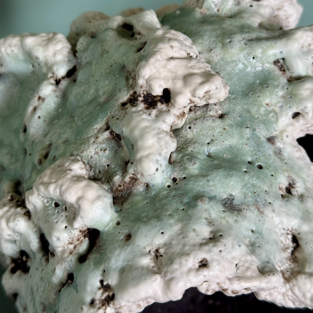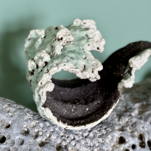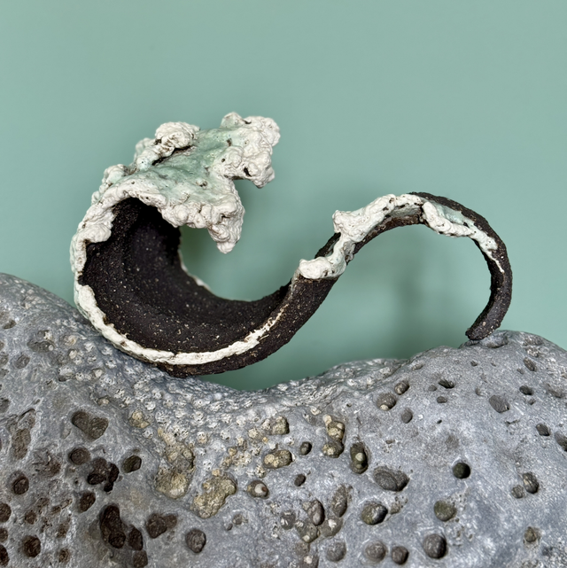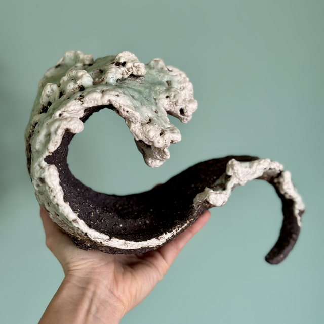 Handbuilt with black clay and glazed with turquoise and white, this wave is a contemporary sculpture capturing the rugged beauty of Irish coastlines and the wild nature of the sea.